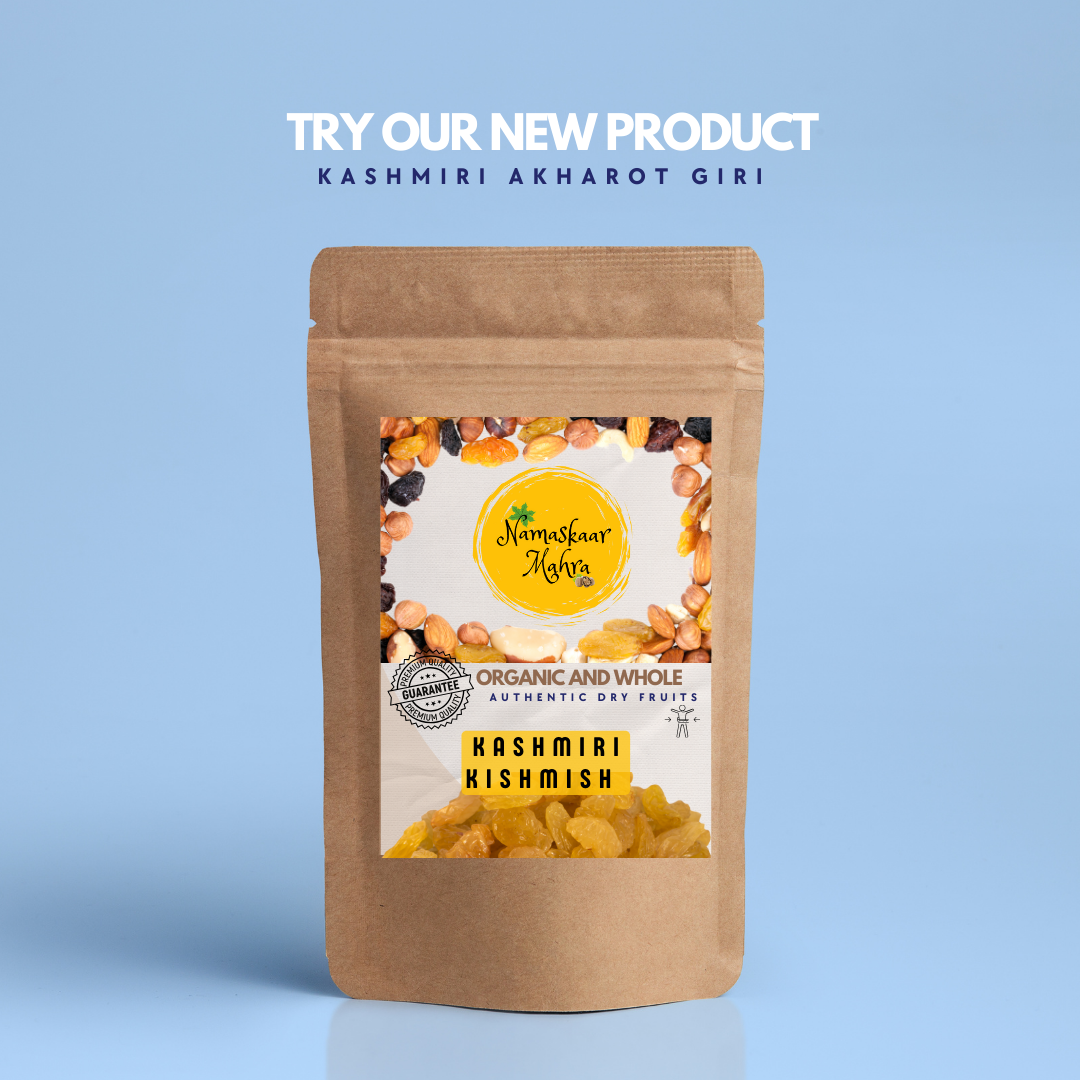 Kashmiri golden raisins are a premium variety of dried grapes, prized not just for their unique taste but also for their numerous health benefits. These raisins are cultivated in the sun-drenched valleys of Kashmir, making them a truly natural treat.